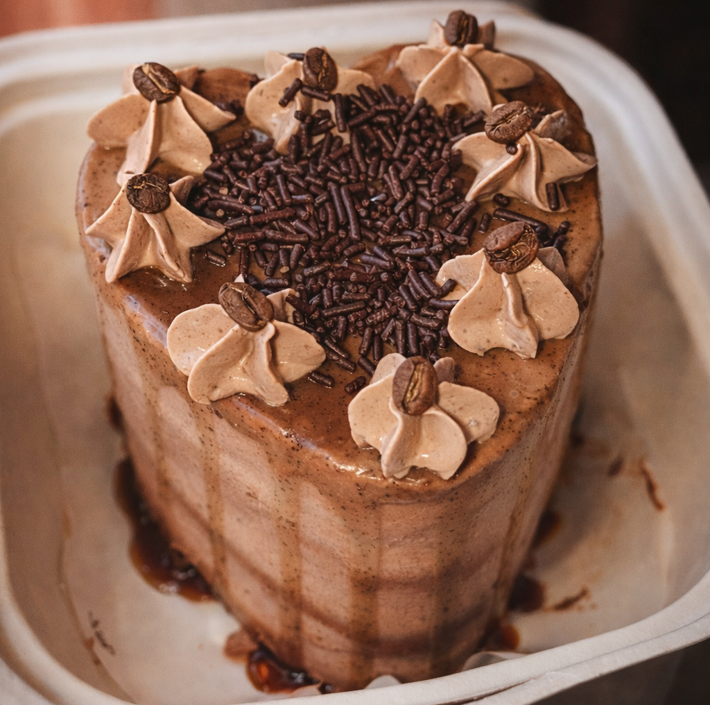 Saftiger Schoko-Espresso-Biskuit mit flüssigem Kaffee-Karamell und feiner Schokocreme
